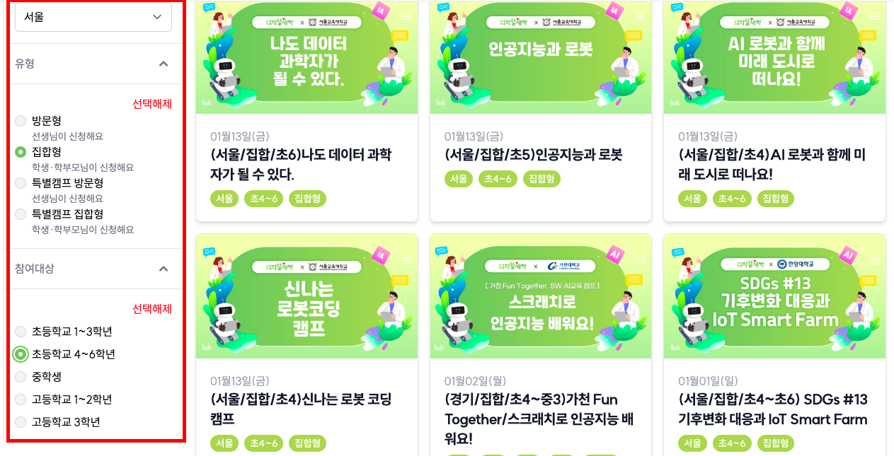 홈페이지에 들어가서 아래와 같이 거주 지역, 교육 유형, 참여대상을 선택하면 모집 중인 캠프 목록이 나옵니다. 저는 서울지역, 집합형, 초등학교 4~6학년을 선택했습니다.