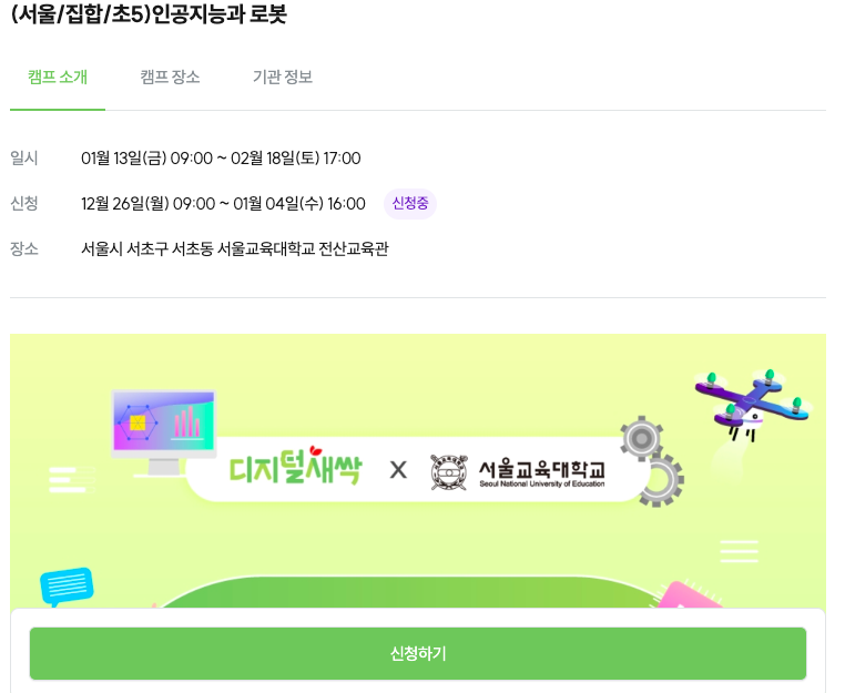 목록을 보니 첫째줄, 초5학년 대상의 '인공지능과 로봇' 캠프가 눈에 바로 들어와서 클릭했습니다.
