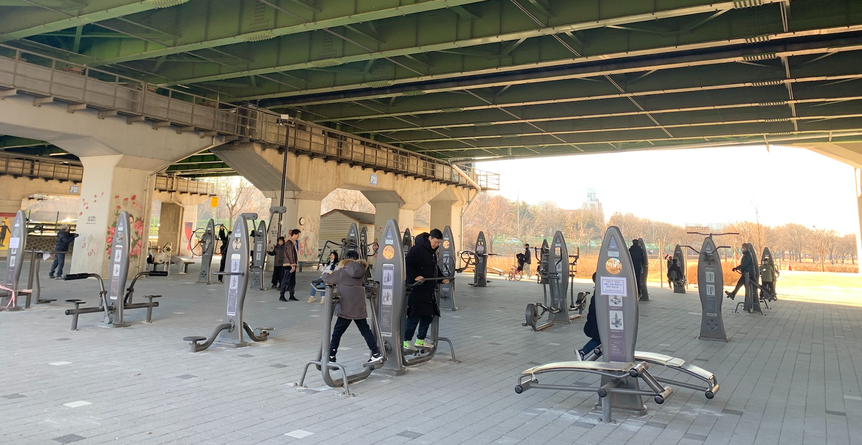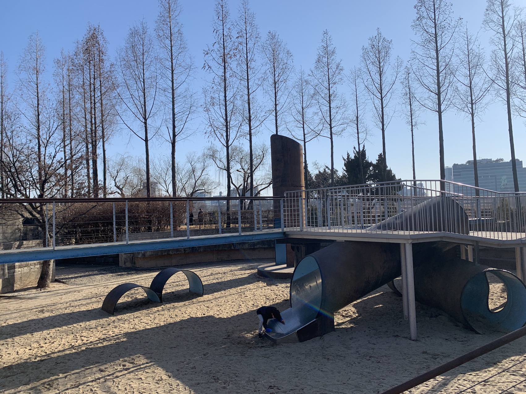 아이들은 엘리베이터에서 내리자마자 보이는 다리 밑 체육시설들을 보자마자 뛰어가네요.