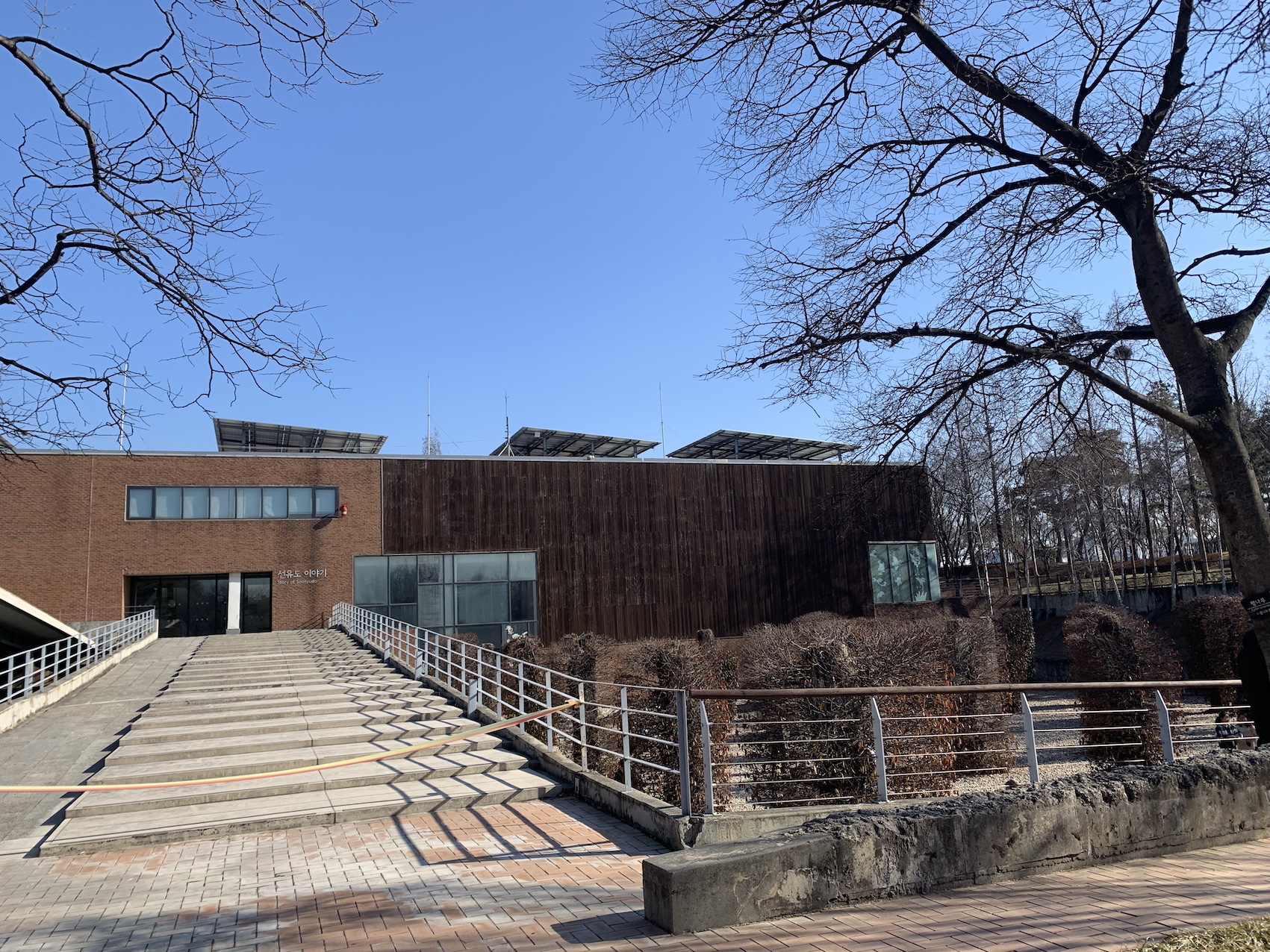 <닫혀있는 '이야기관'과 그 아래 위치한 녹색기둥정원>