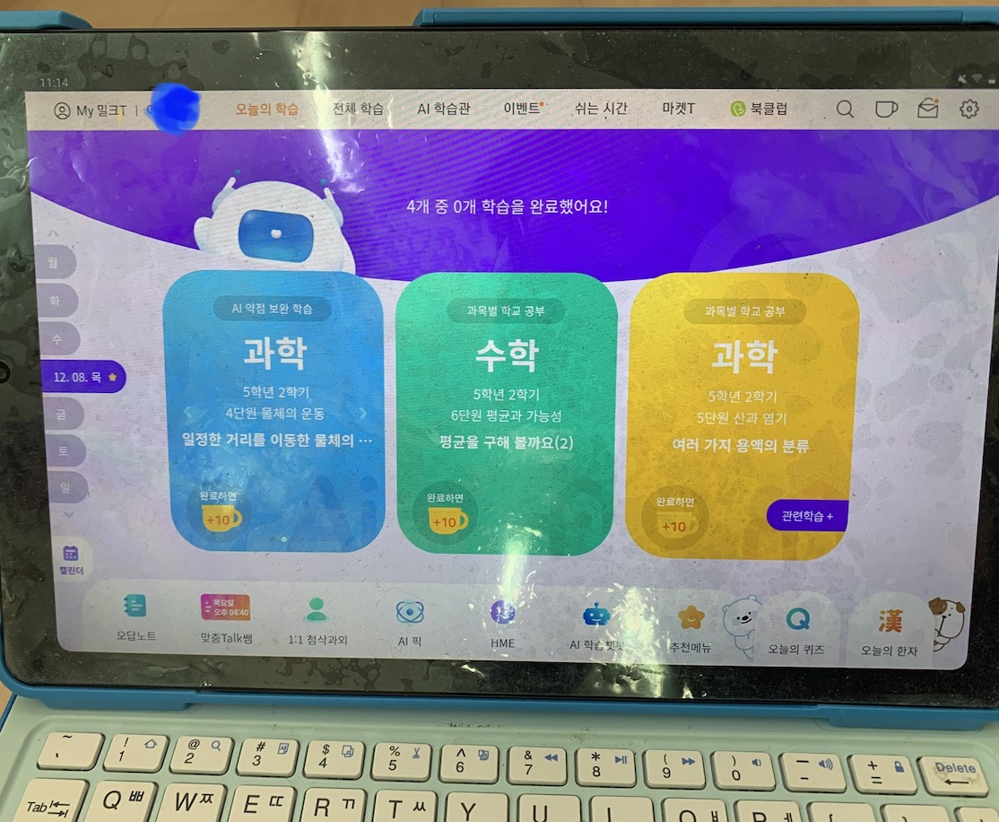 매일 밀크티를 열면 그 날 할 학습이 3~4개씩 메인 화면에 뜨는데, 이렇게 매일매일 그날의 학습을 해나간 첫째. 이렇게 오늘의 학습만 하면 30분 내외의 시간이 소요됩니다. 아주 긴 시간이 아니어서 매일 복습을 할 수 있고 성취감을 느끼며 자기주도학습을 할 수 있는 점이 가장 큰 장점인 것 같아요. 또, 주 1회 밀크티 관리교사의 전화 또는 화상 코칭 덕분에 엄마가 개입하지 않아도 스스로 학습을 하게 되니 편하고요.