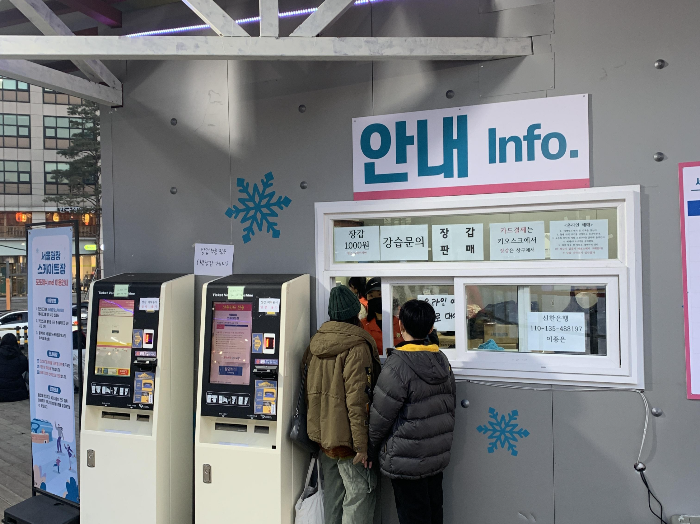 저는 두 아이와 평일 오후 5시 30분 회차를 이용했는데, 온라인 예매는 회원가입이 귀찮아 스킵하고 현장에 20분 정도 일찍 도착했더니 넉넉하게 표를 구할 수 있었습니다. 보통 회차별 700명까지 수용가능해서 스케이트 대여를 위한 긴 줄이 늘어서 있는데, 앞사람에게 안 물어봤으면 이용권 구매도 안 하고 대여줄에서 기다릴 뻔했지 뭐예요.